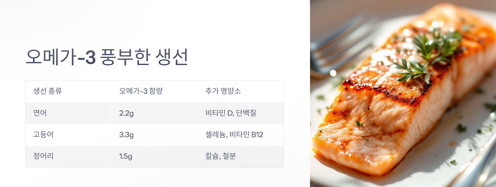 | 생선 종류 | 오메가-3 함량 (100g 기준) | 추가 영양소 |