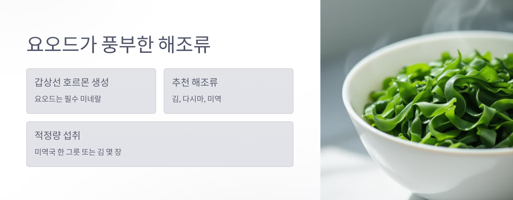 해조류는 요오드가 풍부하지만 과다 섭취하면 오히려 갑상선 기능에 악영향을 줄 수 있어요. 하루 미역국 한 그릇 정도가 적절한 섭취량입니다.