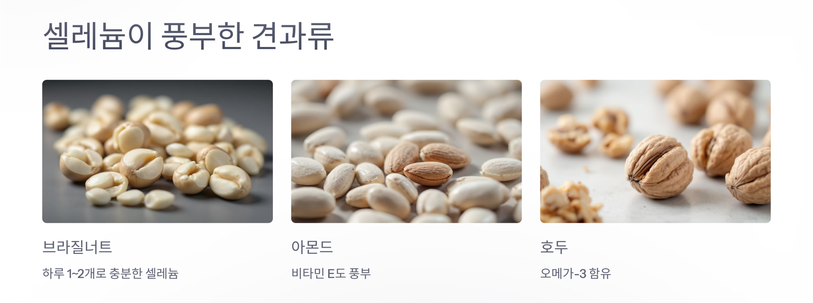 셀레늄은 갑상선 호르몬의 대사를 돕고 산화 스트레스를 줄이는 데 중요한 역할을 합니다. 특히 브라질너트는 하루 1~2개만 먹어도 충분한 셀레늄을 공급할 수 있어요.
