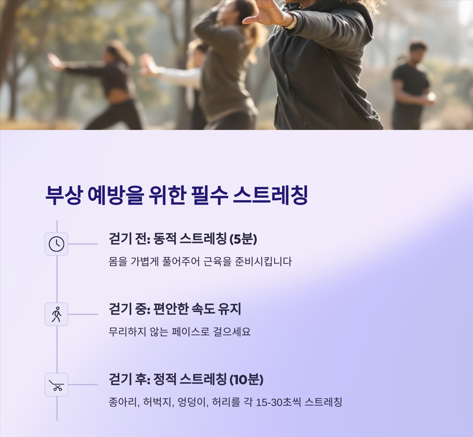 걷기 전에는 종아리, 허벅지, 발목 주변을 가볍게 스트레칭하여 근육을 풀어주세요.
