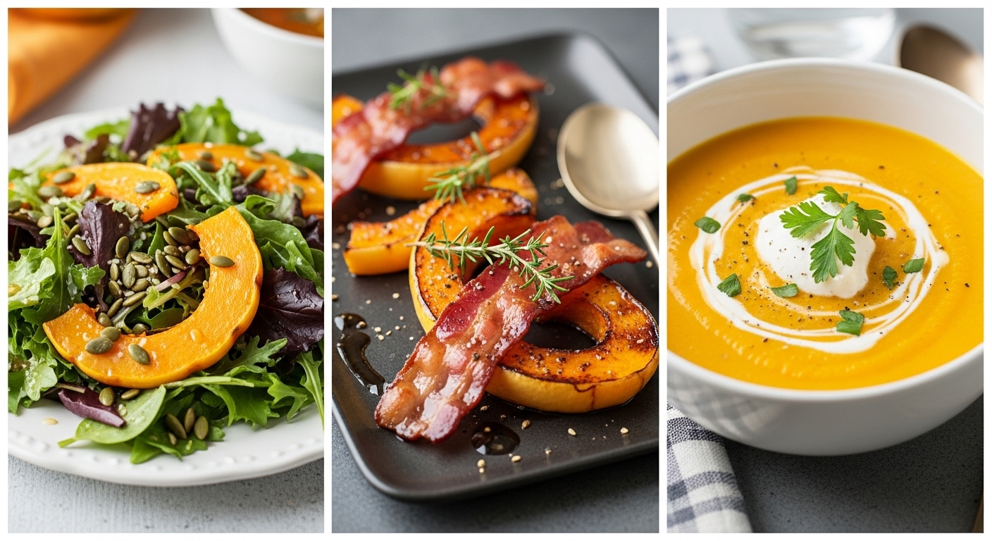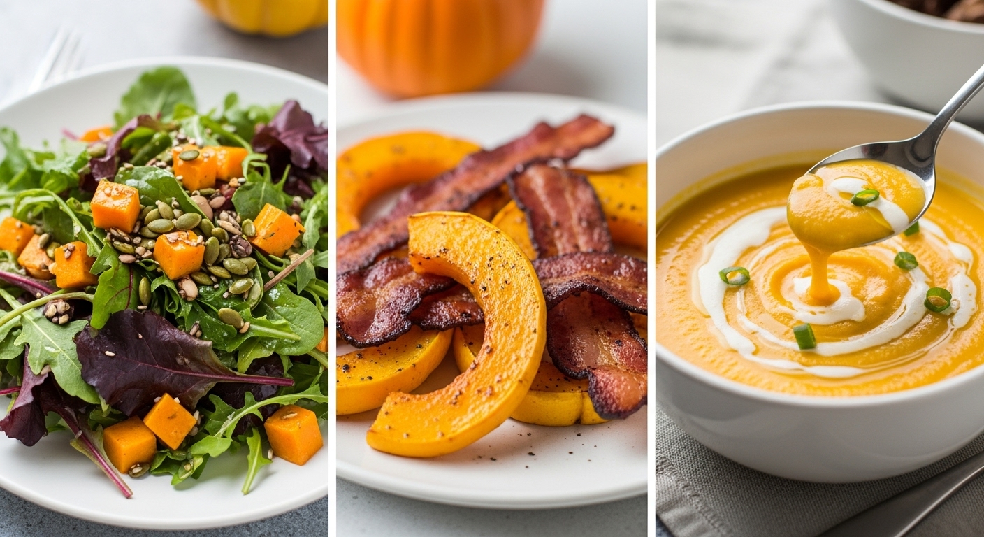 - 단호박 베이컨 구이: 단호박, 베이컨, 브로콜리, 토마토 등을 오븐 또는 팬에 구워 먹는 요리입니다. 베이컨의 단백질과 단호박의 베타카로틴, 비타민C가 만나 영양 밸런스가 완벽합니다.
