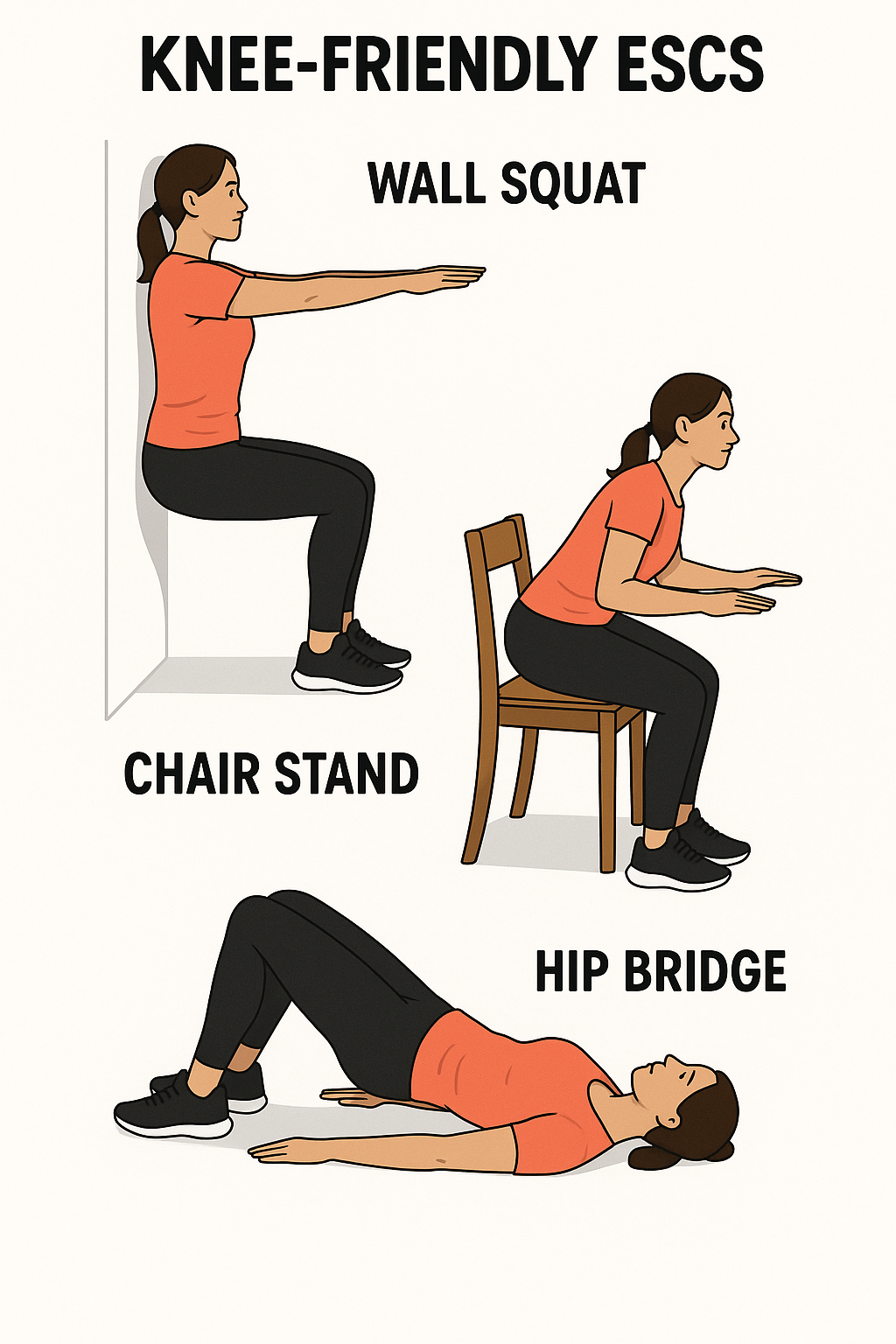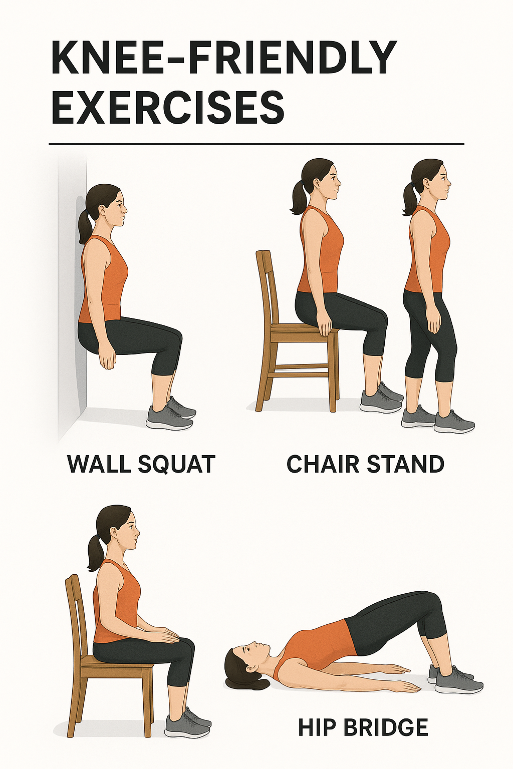 | 벽에 기대어 스쿼트 | 무릎 부하 감소, 대퇴근육 강화 | 초급 |