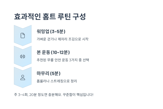 아무리 좋은 운동도 꾸준히 하지 않으면 효과가 없어요. 무릎을 위한 홈트는 주 3~4회, 20분 정도면 충분해요. 중요한 건 루틴 안에 스트레칭, 근력, 휴식이 잘 배치되어 있어야 한다는 점이에요.