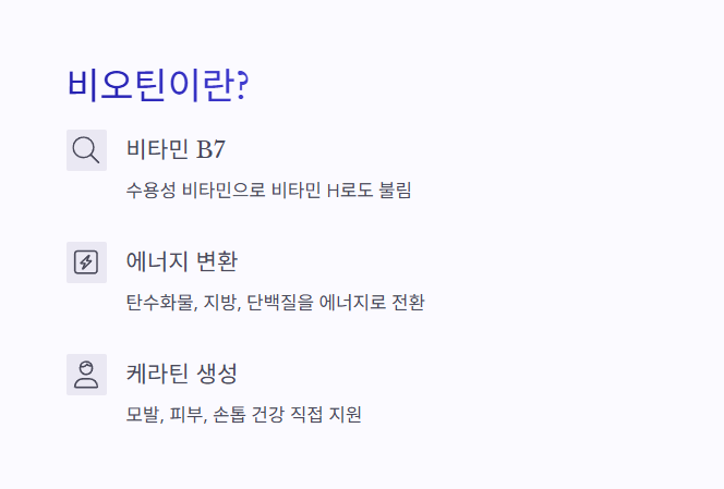 비오틴은 에너지 대사에 관여하며, 모발·피부·손톱 건강 유지, 인지 기능 보호, 구강 점막 회복 등에 도움을 줍니다.