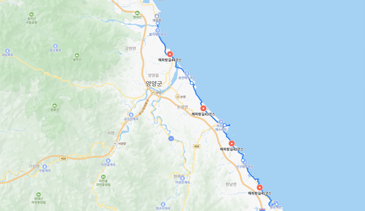 | 양양 | 해파랑길 41~44코스 (몽돌소리길 포함) | 코스별 8~12km, 몽돌해변, 서핑비치 | 몽돌소리길, 서피비치, 헤밍웨이파크, 전망대 |