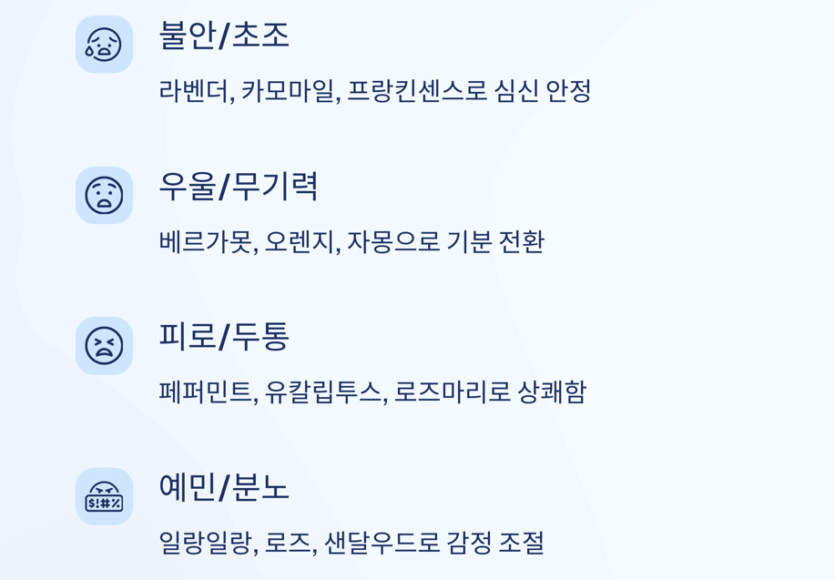 | 불안과 초조 | 라벤더, 캐모마일 |