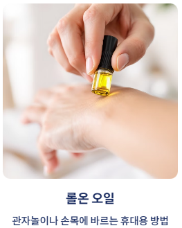 아로마를 처음 접한다면 너무 어렵게 생각하지 마세요! 작은 디퓨저 하나로도 충분히 시작할 수 있어요. 집에서는 디퓨저나 아로마 캔들을 활용하고, 이동 중에는 롤온 타입 오일을 사용하는 것도 좋아요. 가장 쉬운 방법은 티슈나 손수건에 한두 방울 떨어뜨려 자연스럽게 향을 맡는 거랍니다.