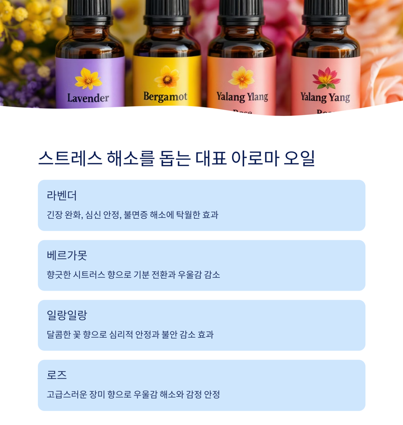 아로마테라피, 스트레스관리, 아로마오일, 힐링, 향기치유, 자연요법, 라벤더오일, 베르가못오일, 일랑일랑, 수면개선, 기분전환, 불안완화, 디퓨저추천, 아로마활용법, 심신안정