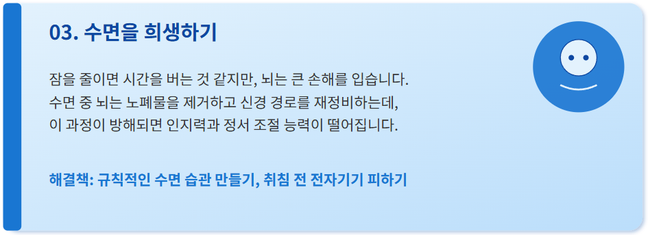 잠을 줄이면 시간을 버는 것 같지만, 뇌는 오히려 큰 손해를 입습니다. 수면 중 뇌는 노폐물을 제거하고 신경 경로를 재정비하는데, 이 과정이 제대로 이뤄지지 않으면 장기적으로 인지력과 정서 조절 능력이 떨어져요. 특히 알츠하이머와 같은 질환과도 연관이 깊습니다.