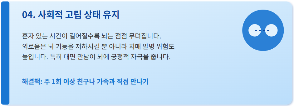 혼자 있는 시간이 길어질수록 뇌는 점점 무뎌집니다. 외로움은 뇌 기능을 저하시킬 뿐 아니라 치매 발병 위험도 높입니다. 전문가들은 특히 대면 만남이 뇌에 긍정적인 자극을 준다고 강조합니다. 마음이 닫히면 뇌도 닫히는 셈이죠.