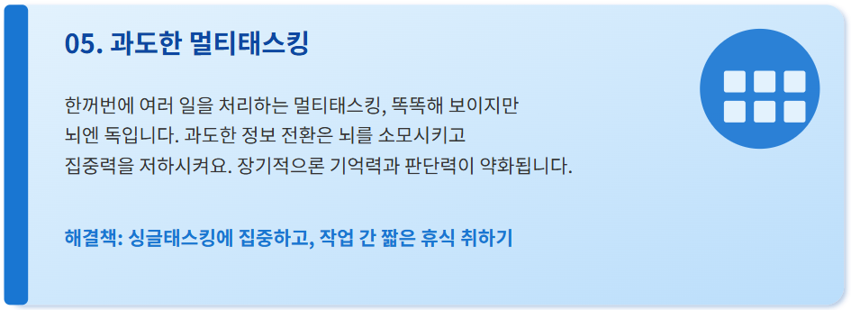 한꺼번에 여러 일을 처리하는 멀티태스킹, 똑똑해 보이지만 뇌엔 독입니다. 과도한 정보 전환은 뇌를 소모시키고 집중력을 저하시켜요. 장기적으로는 기억력 감퇴와 판단력 약화로도 이어질 수 있어요.