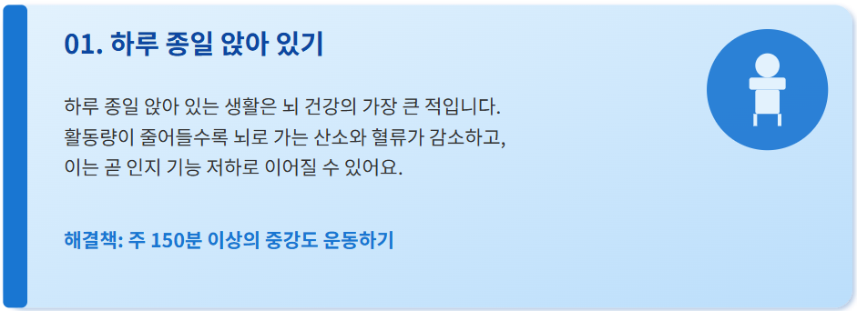 책상 앞에 하루 종일 앉아 있는 생활, 너무 익숙하죠? 하지만 이런 좌식 습관은 뇌 건강의 가장 큰 적입니다. 활동량이 줄어들수록 뇌로 가는 산소와 혈류가 감소하고, 이는 곧 인지 기능 저하로 이어질 수 있어요. 전문가들은 주 150분 이상의 중강도 운동이 뇌세포 재생에 직접적인 도움을 준다고 조언합니다.