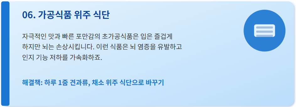 안녕하세요. 여러분의 건강한 뇌 생활을 응원하는 블로그입니다. 나이가 들수록 뇌 기능이 떨어지는 건 자연스러운 일이지만, 우리가 무심코 반복하는 습관들 때문에 뇌가 예상보다 훨씬 빠르게 늙어가고 있다면 어떨까요? 사실, 일상 속에 도사리고 있는 몇 가지 나쁜 습관만 바로잡아도 뇌 건강은 얼마든지 회복 가능합니다. 오늘은 전문가들이 실제로 경고하는 ‘뇌 노화 촉진 습관’ 6가지를 소개드리고, 이를 통해 여러분이 지금 당장 실천할 수 있는 예방 방법도 함께 안내해 드릴게요.