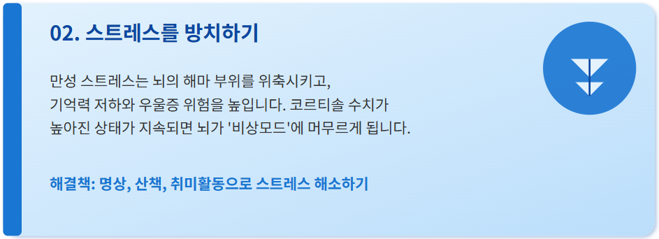 만성 스트레스는 뇌의 해마 부위를 위축시키고, 기억력 저하와 우울증 위험을 높입니다. 코르티솔 수치가 높아진 상태가 지속되면 뇌가 '비상모드'에 머무르게 되죠. 특히 스트레스를 관리하지 않으면 감정 조절과 사고력 모두 손상될 수 있어요.