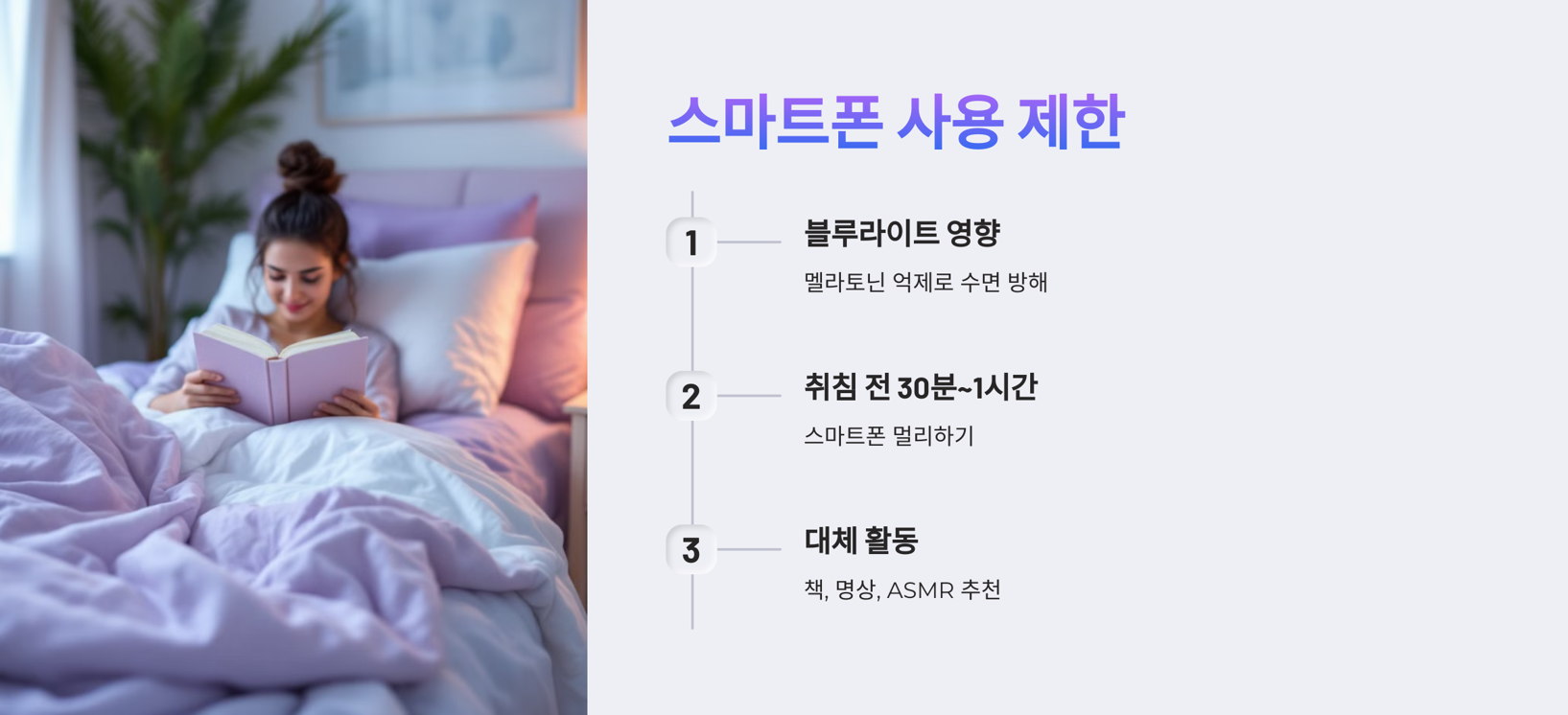이거 진짜 찔리는 사람 많을걸요ㅋㅋ 스마트폰의 블루라이트가 멜라토닌을 억제해서 잠을 방해한다는 거, 아시죠? 잠들기 최소 30분~1시간 전엔 폰은 침대에서 멀리 치워버리십시오! 대신 책을 보거나 명상, ASMR을 추천합니다.
